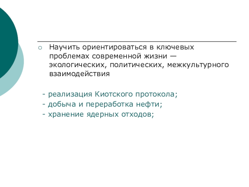 Научить ориентироваться в ключевых проблемах современной жизни — экологических, политических, межкультурного взаимодействия - реализация Киотского протокола; -