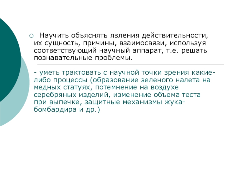 Научить объяснять явления действительности, их сущность, причины, взаимосвязи, используя соответствующий научный аппарат, т.е. решать познавательные проблемы.