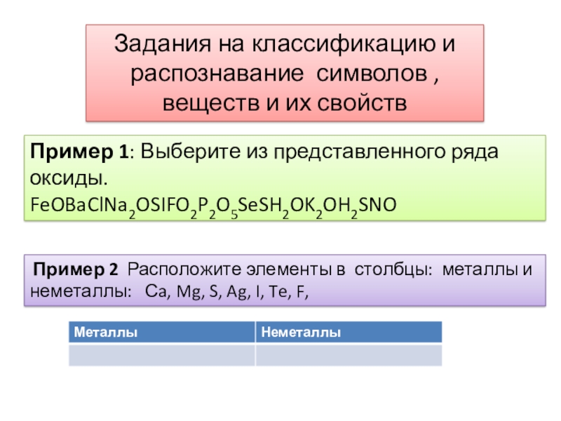 Пример 2 Расположите элементы в столбцы: металлы и неметаллы: Сa, Mg, S, Ag, I, Te, F,