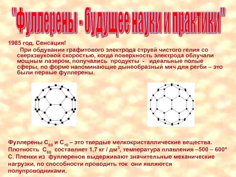 Фуллерены С60 и С70 – это твердые мелкокристаллические вещества. Плотность С60 составляет 1,7 кг / дм3, температура плавления –500 – 600º С. Пленки из фуллеренов выдерживают значительные механические нагрузки, по способности проводить ток они являются полупроводниками.
