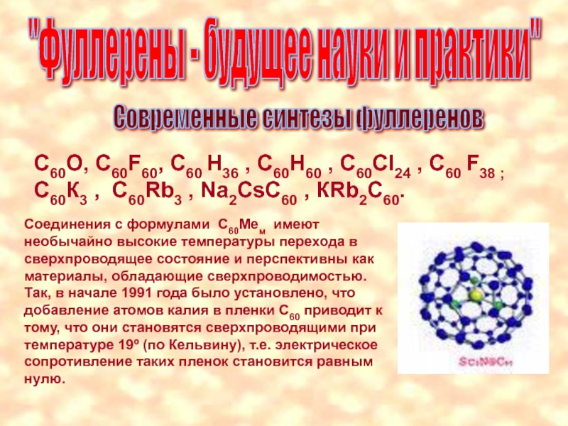 Соединения с формулами С60Мем имеют необычайно высокие температуры перехода в сверхпроводящее состояние и перспективны как материалы, обладающие сверхпроводимостью. Так, в начале 1991 года было установлено, что добавление атомов калия в пленки С60 приводит к тому, что они становятся сверхпроводящими при температуре 19º (по Кельвину), т.е. электрическое сопротивление таких пленок становится равным нулю.