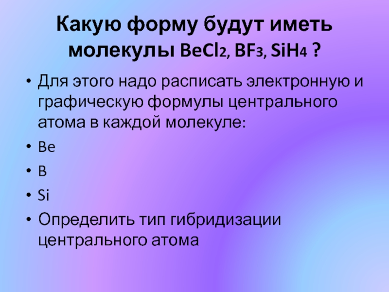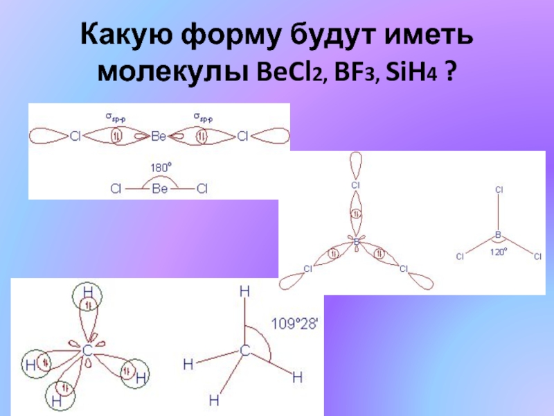 Какую форму будут иметь молекулы BeCl2, BF3, SiH4 ?