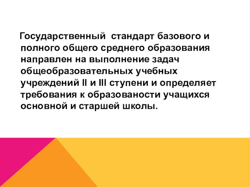на выполнение задач общеобразовательных учебных учреждений II и III ступени и определяет требования к образованости учащихся основной и старшей школы.