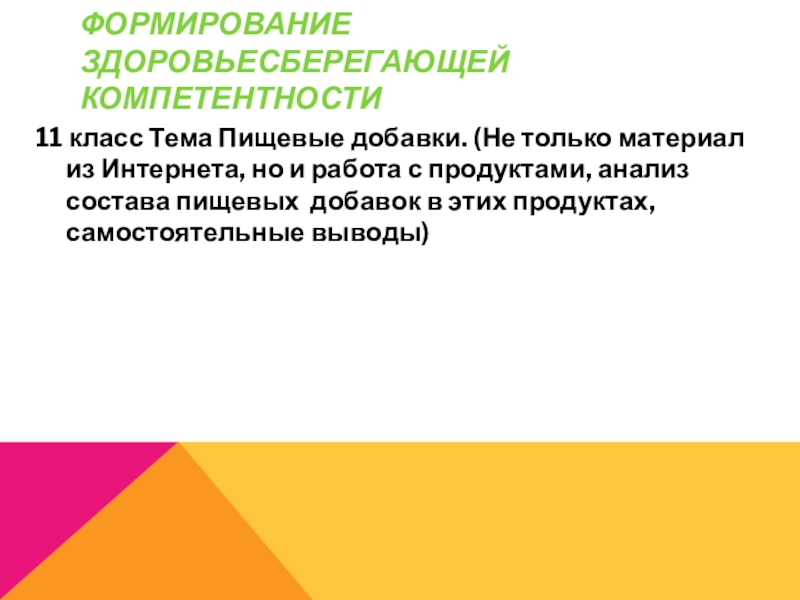 11 класс Тема Пищевые добавки. (Не только материал из Интернета, но и работа с продуктами, анализ состава пищевых добавок в этих продуктах, самостоятельные выводы)