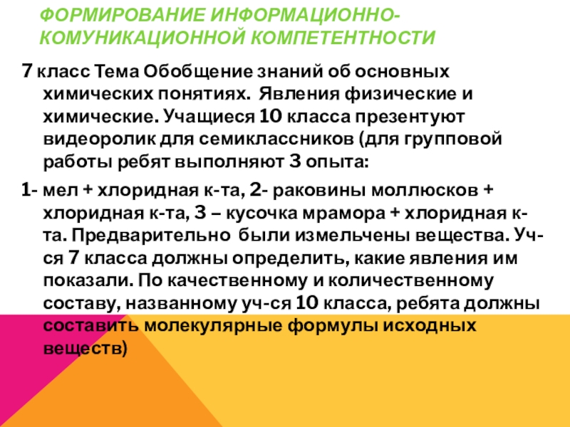 1- мел + хлоридная к-та, 2- раковины моллюсков + хлоридная к-та, 3 – кусочка мрамора + хлоридная к-та. Предварительно были измельчены вещества. Уч-ся 7 класса должны определить, какие явления им показали. По качественному и количественному составу, названному уч-ся 10 класса, ребята должны составить молекулярные формулы исходных веществ)
