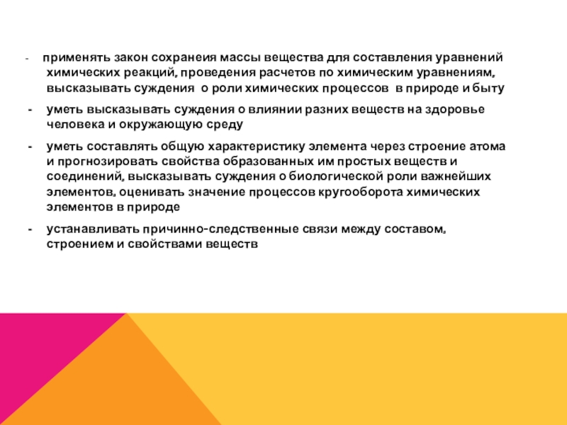 их превращениях, химические законы и методы исследования, навыки безопасного обращения с веществами,
