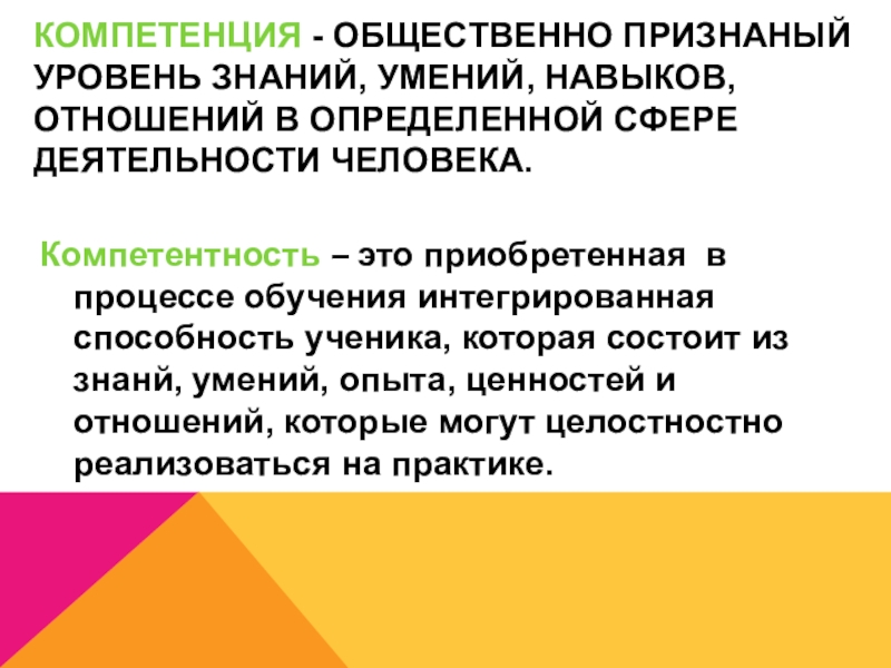 Компетентность – это приобретенная в процессе обучения интегрированная способность ученика, которая состоит из знанй, умений, опыта, ценностей и отношений, которые могут целостностно реализоваться на практике.