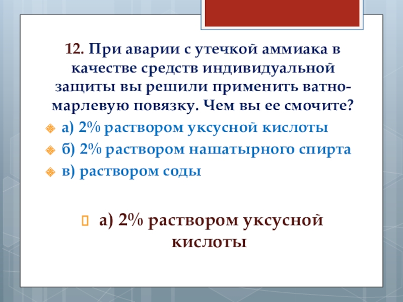 Слайд 5412. При аварии с утечкой аммиака в качестве средств индивидуальной защиты