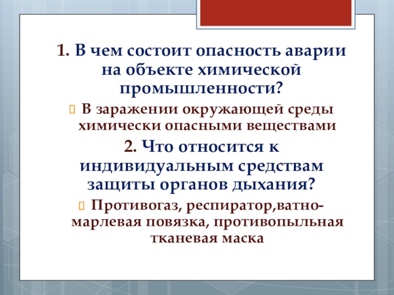 Слайд 461. В чем состоит опасность аварии на объекте химической промышленности?