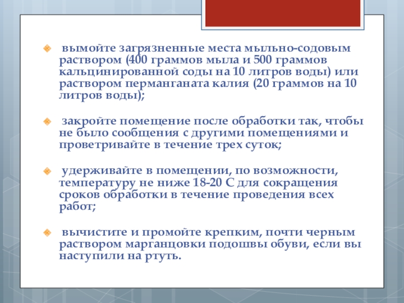Слайд 37 вымойте загрязненные места мыльно-содовым раствором (400 граммов мыла и 500