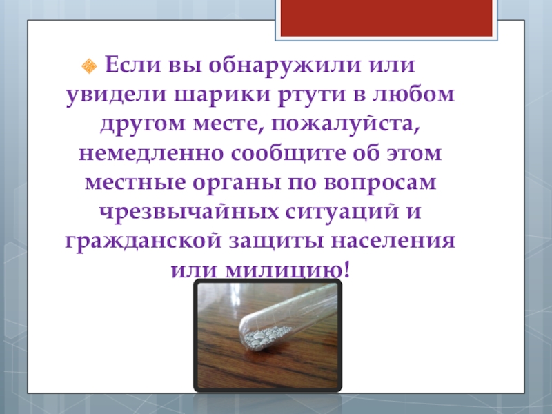 Слайд 38Если вы обнаружили или увидели шарики ртути в любом другом месте,