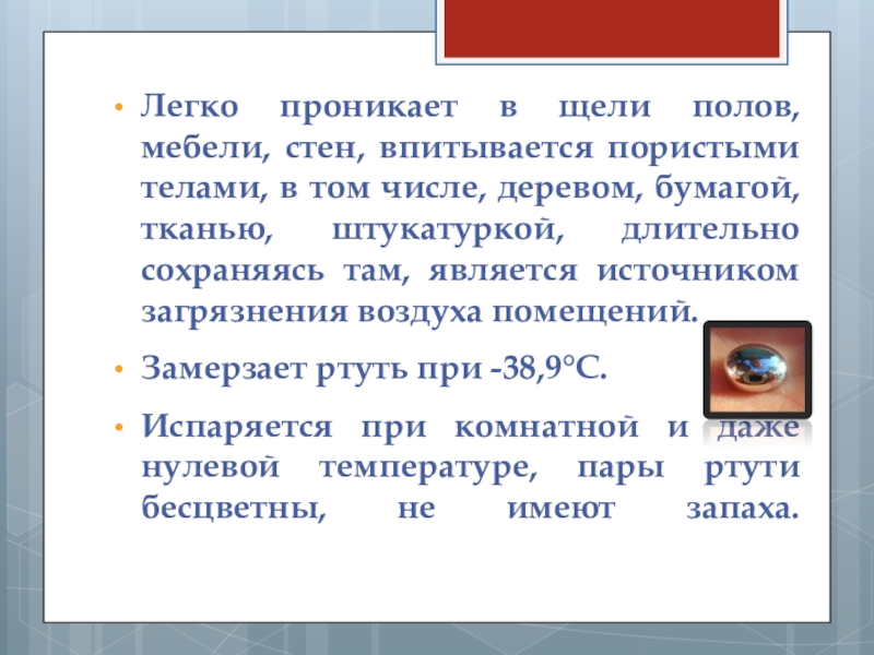 Слайд 30Легко проникает в щели полов, мебели, стен, впитывается пористыми телами, в
