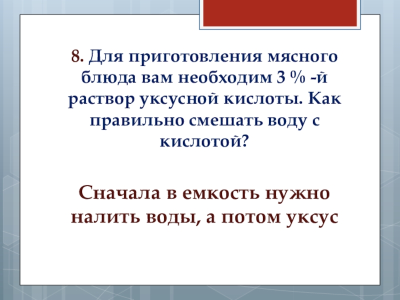 Слайд 508. Для приготовления мясного блюда вам необходим 3 % -й раствор