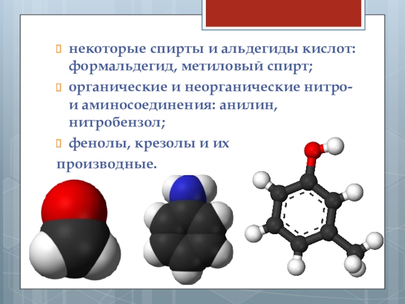 Слайд 8некоторые спирты и альдегиды кислот: формальдегид, метиловый спирт;