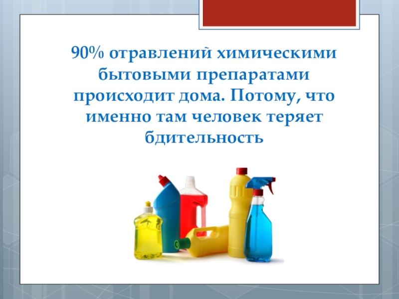 Слайд 2790% отравлений химическими бытовыми препаратами происходит дома. Потому, что именно там