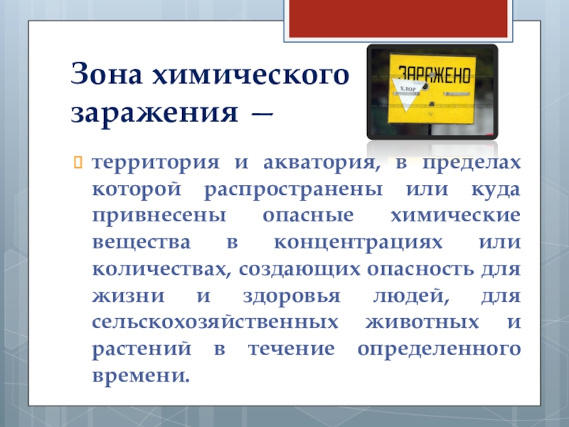или куда привнесены опасные химические вещества в концентрациях или количествах, создающих опасность для жизни и здоровья людей, для сельскохозяйственных животных и растений в течение определенного времени.