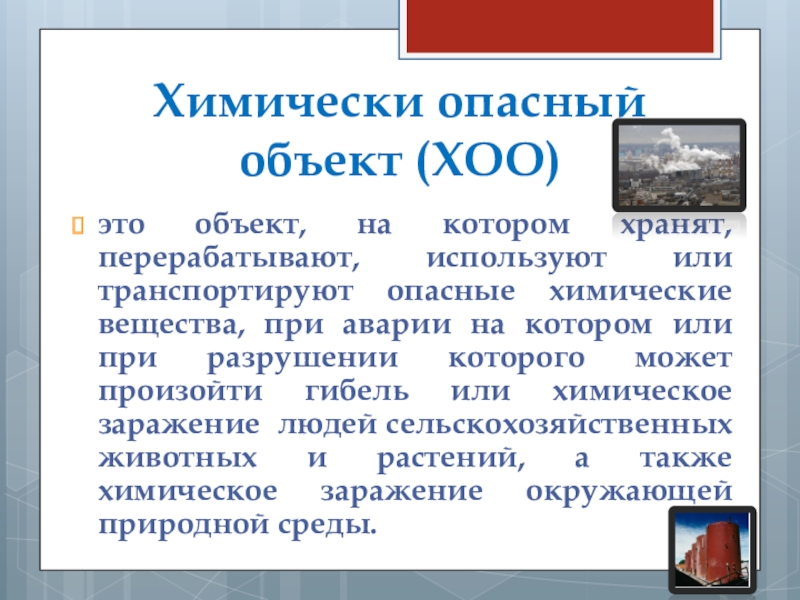 или транспортируют опасные химические вещества, при аварии на котором или при разрушении которого может произойти гибель или химическое заражение людей сельскохозяйственных животных и растений, а также химическое заражение окружающей природной среды.