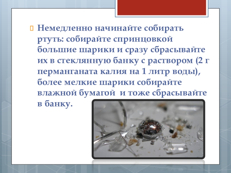 Слайд 35Немедленно начинайте собирать ртуть: собирайте спринцовкой большие шарики и сразу сбрасывайте