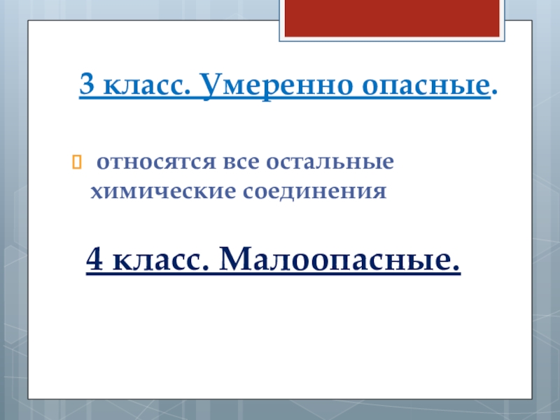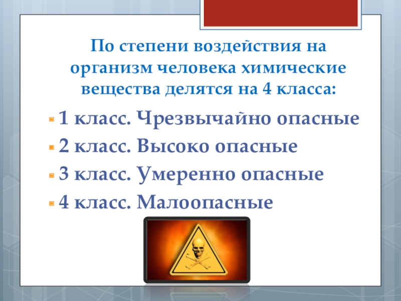 Слайд 4По степени воздействия на организм человека химические вещества делятся на 4