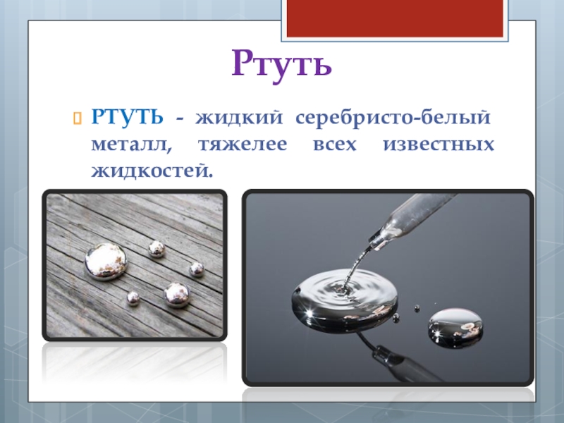 РТУТЬ - жидкий серебристо-белый металл, тяжелее всех известных жидкостей.