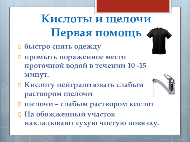 7. Вам на одежду попали капли кислоты. Что необходимо сделать?