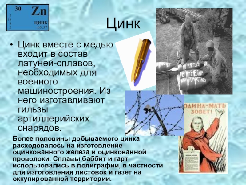 Более половины добываемого цинка расходовалось на изготовление оцинкованного железа и оцинкованной проволоки. Сплавы баббит и гарт использовались в полиграфии, в частности для изготовления листовок и газет на оккупированной территории.