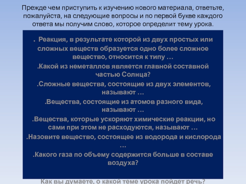 . Реакция, в результате которой из двух простых или сложных веществ образуется одно более сложное вещество, относится к типу …
