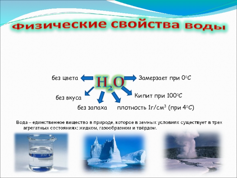 без цветабез вкуса без запахаКипит при 1000СЗамерзает при 00Сплотность 1г/см3 (при 40С)