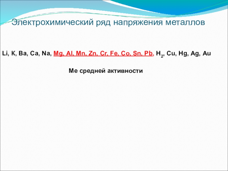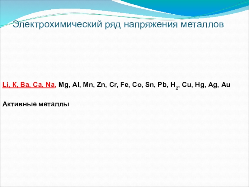 Электрохимический ряд напряжения металлов Li, К, Ва, Са, Nа, Мg, Аl, Мn, Zn, Сr, Fе, Со, Sn,