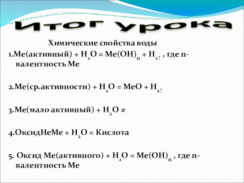 Химические свойства воды1.Ме(активный) +