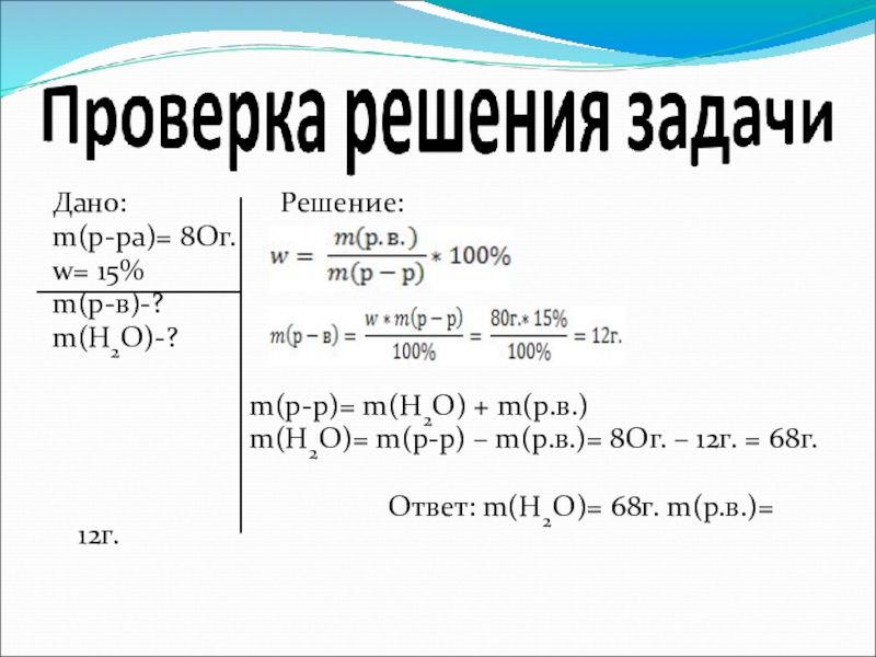 m(H2O)= m(р-р) – m(р.в.)= 8Ог. – 12г. = 68г.