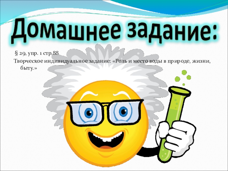 § 29, упр. 1 стр.88Творческое индивидуальное задание: «Роль и место воды в природе, жизни, быту.»