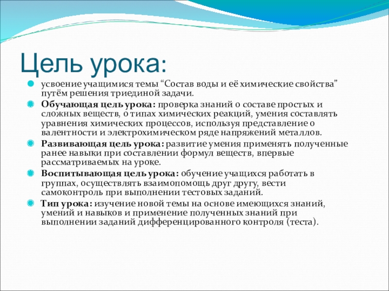 Цель урока:усвоение учащимися темы “Состав воды и её химические свойства” путём решения триединой задачи.Обучающая цель урока: проверка