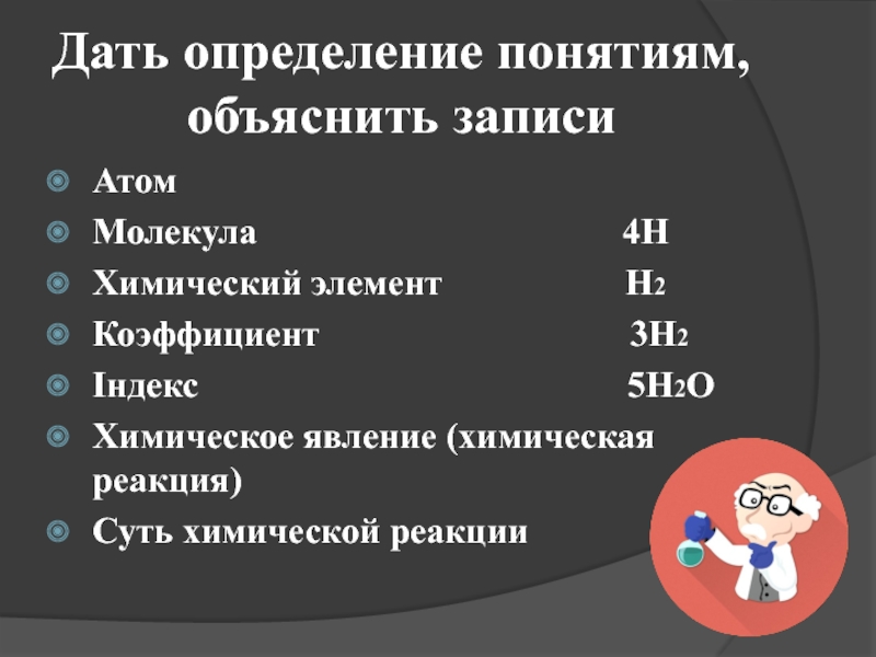 Дать определение понятиям, объяснить записиАтомМолекула 4HХимический элемент H2Коэффициент