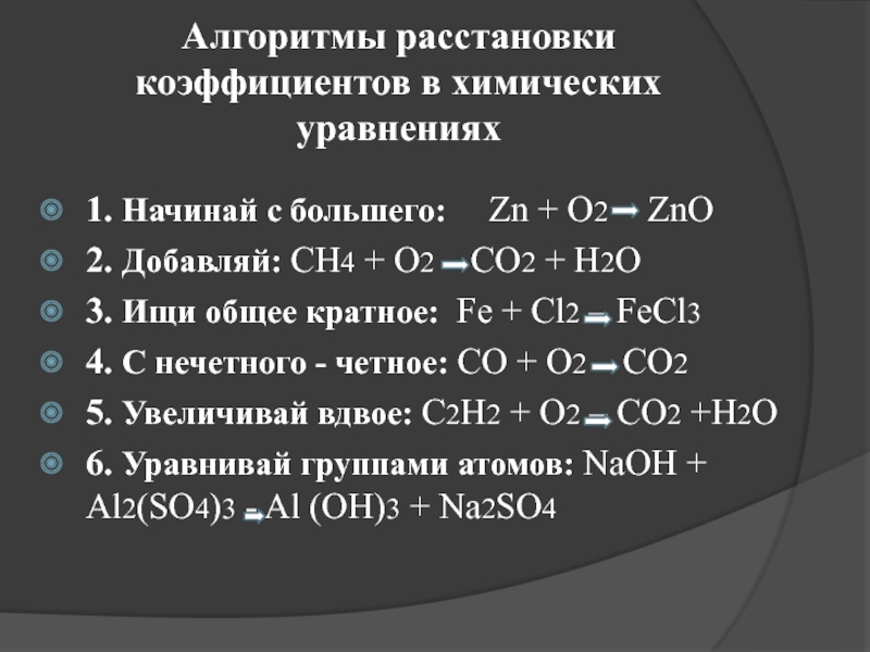 Алгоритмы расстановки коэффициентов в химических уравнениях1. Начинай с большего:   Zn + O2 - ZnO2. Добавляй: