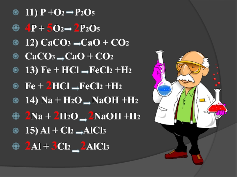 11) P +O2  P2O54P + 5O2  2P2O512) CaCO3  CaO + CO2CaCO3  CaO +
