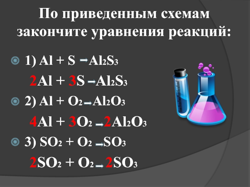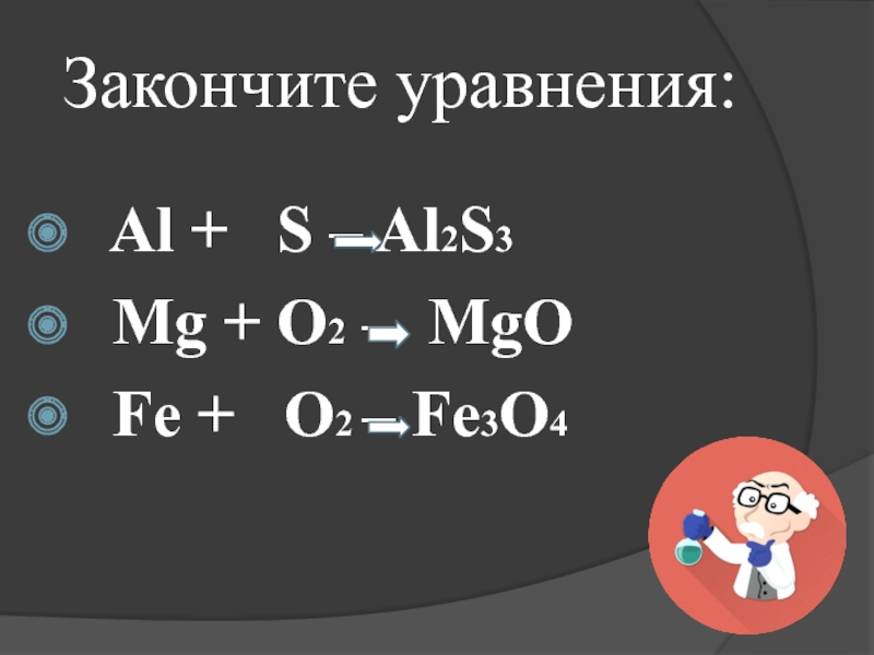Закончите уравнения: Al +  S – Al2S3 Mg + O2 – MgO Fe +  O2