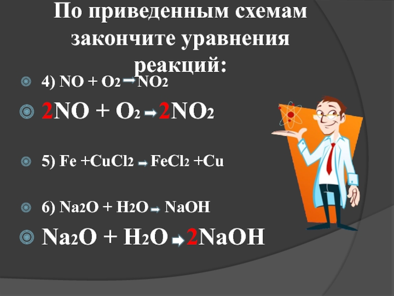 По приведенным схемам закончите уравнения реакций:4) NO + O2  NO22NO + O2  2NO25) Fe +CuCl2