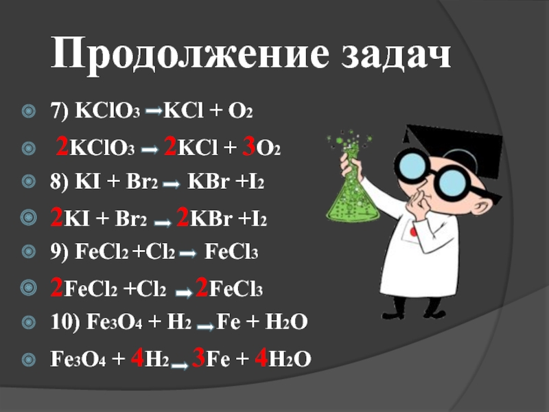Продолжение задач7) KClO3  KCl + O2 2KClO3   2KCl + 3O28) KI + Br2