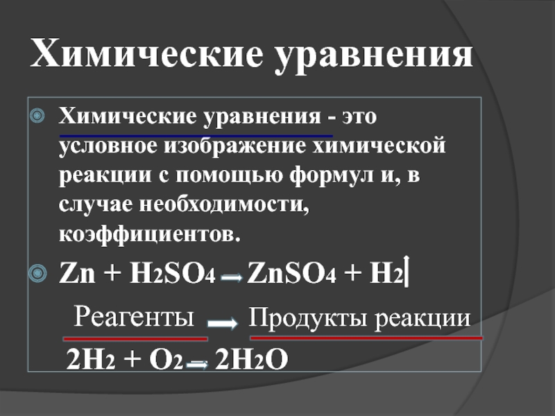Химические уравненияХимические уравнения - это условное изображение химической реакции с помощью формул и, в случае необходимости, коэффициентов.Zn