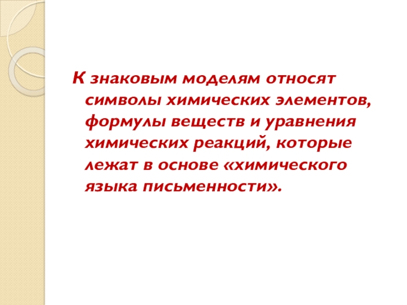 К знаковым моделям относят символы химических элементов, формулы веществ и уравнения химических реакций, которые лежат в основе «химического языка письменности».