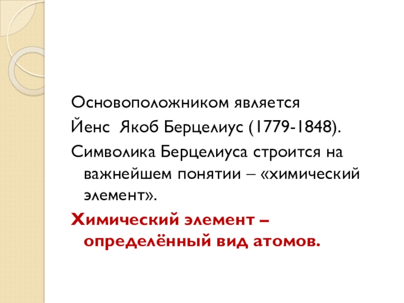 Основоположником является Йенс Якоб Берцелиус (1779-1848). Символика Берцелиуса строится на важнейшем понятии – «химический элемент».Химический элемент –
