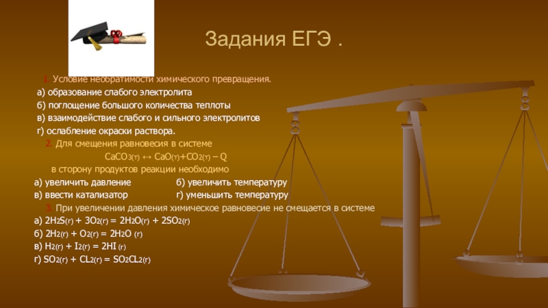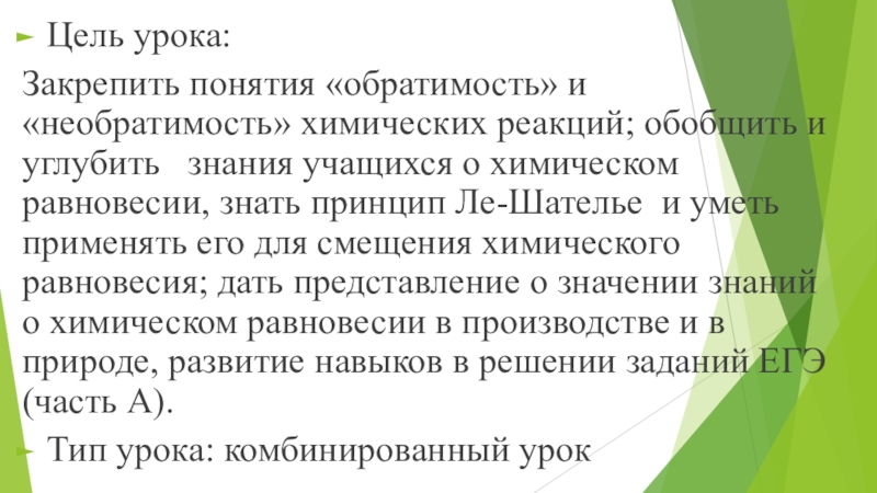 знания учащихся о химическом равновесии, знать принцип Ле-Шателье и уметь применять его для смещения химического равновесия; дать представление о значении знаний о химическом равновесии в производстве и в природе, развитие навыков в решении заданий ЕГЭ (часть А).