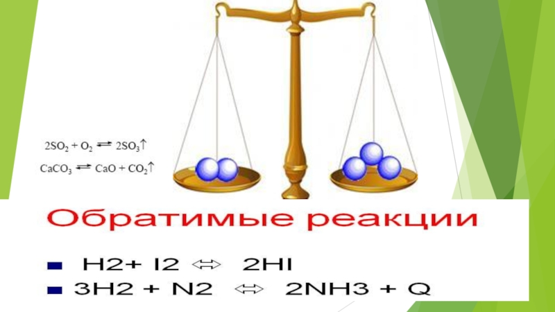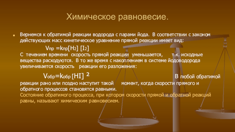 Vобр=kобр [HI] ² В любой обратимой реакции рано или поздно наступит такой момент, когда скорости прямого и обратного процессов становятся равными. Состояние обратимого процесса, при котором скорости прямой и обратной реакций равны, называют химическим равновесием.