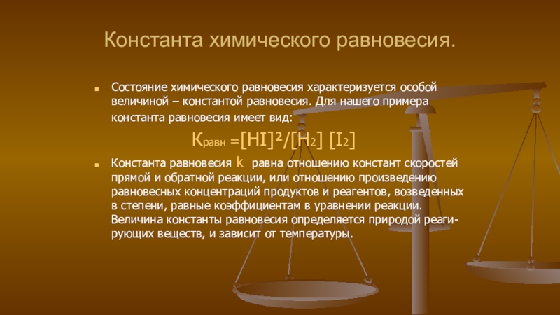 Состояние химического равновесия характеризуется особой величиной – константой равновесия.