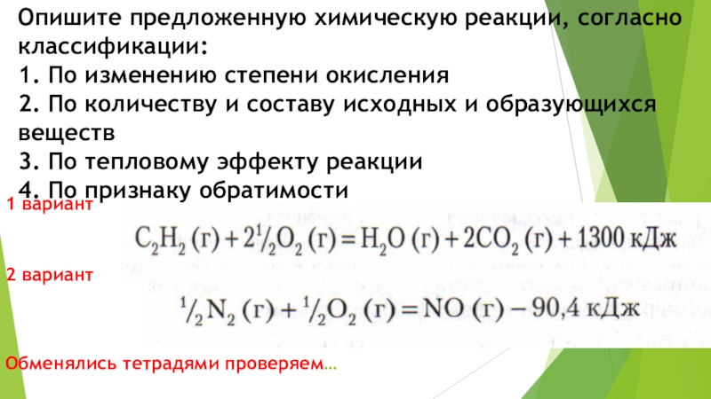 Слайд 3Опишите предложенную химическую реакции, согласно классификации: