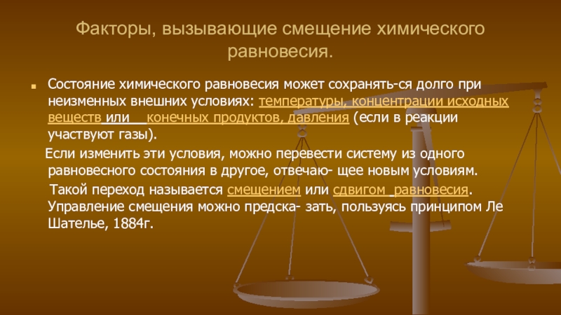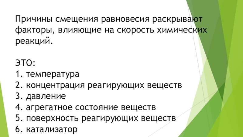 Слайд 13Факторы, вызывающие смещение химического равновесия.