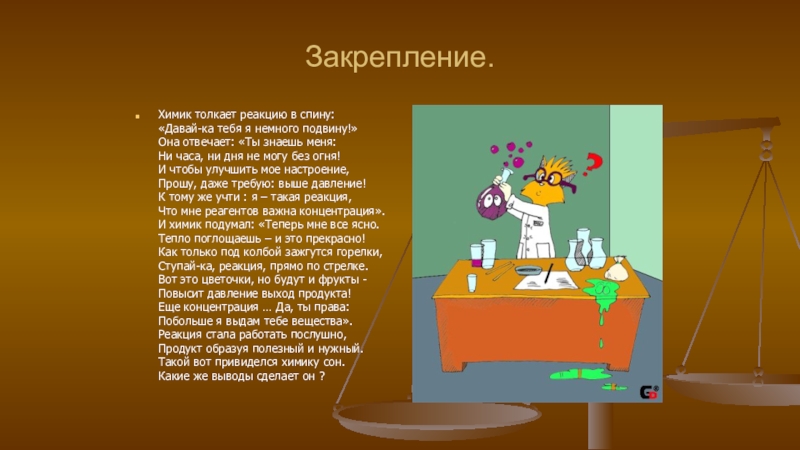 «Давай-ка тебя я немного подвину!» Она отвечает: «Ты знаешь меня: Ни часа, ни дня не могу без огня! И чтобы улучшить мое настроение, Прошу, даже требую: выше давление! К тому же учти : я – такая реакция, Что мне реагентов важна концентрация». И химик подумал: «Теперь мне все ясно. Тепло поглощаешь – и это прекрасно! Как только под колбой зажгутся горелки, Ступай-ка, реакция, прямо по стрелке. Вот это цветочки, но будут и фрукты - Повысит давление выход продукта! Еще концентрация … Да, ты права: Побольше я выдам тебе вещества». Реакция стала работать послушно, Продукт образуя полезный и нужный. Такой вот привиделся химику сон. Какие же выводы сделает он ?