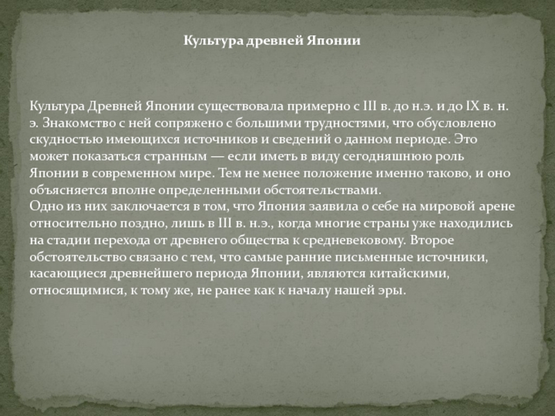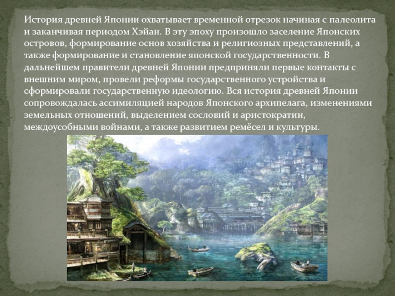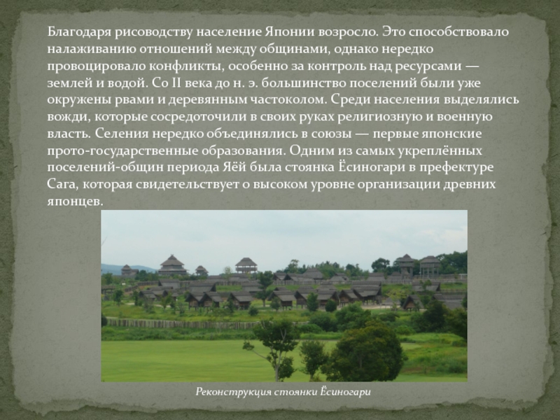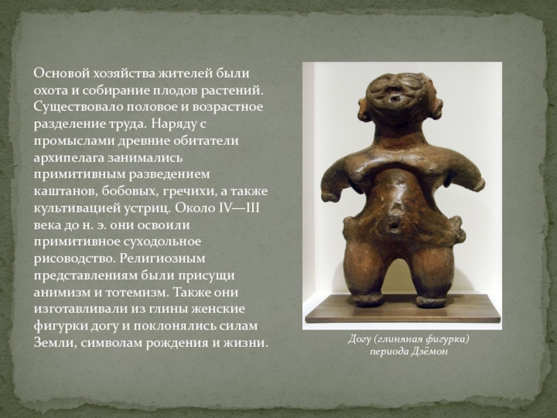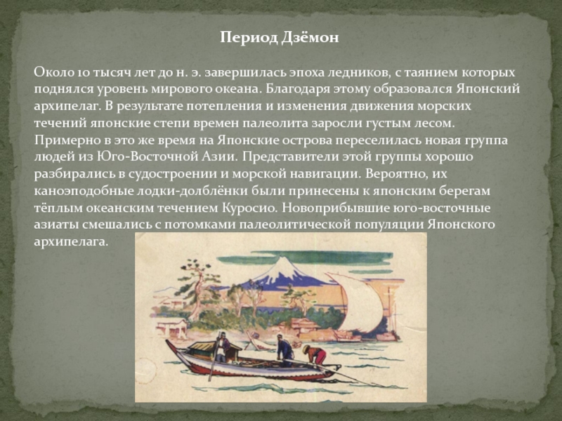 Среди поселений той эпохи выделяется стоянка Саннай-Маруяма в современной префектуре Аомори, датируемая V веком до н. э. и содержащая остатки большого посёлка на 100—200 человек.