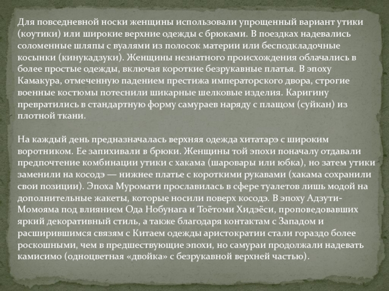 В менее формальных случаях мужчины носили хо поверх сасинуки (панталоны до щиколоток со шнуровкой), а под ними находились огути. В повседневном туалете хо уступали место коротким накидкам носи. На охоту аристократы выезжали в накидках из лубяных волокон (каригину), которые впоследствии сделались формальной одеждой для военных лидеров. Формальный костюм фрейлины эпохи Хэйан — карагинумо (с XVI в. он известен как 12 — слойная одежда — дзюнихитоэ). Его важнейшим элементом были утики — 5, 10 или более слоев платьев на подкладке, причем каждый последующий слой был длиннее предыдущего, что создавало впечатляющий эффект, учитывая ко всему прочему продуманную комбинацию цветов каждого слоя.